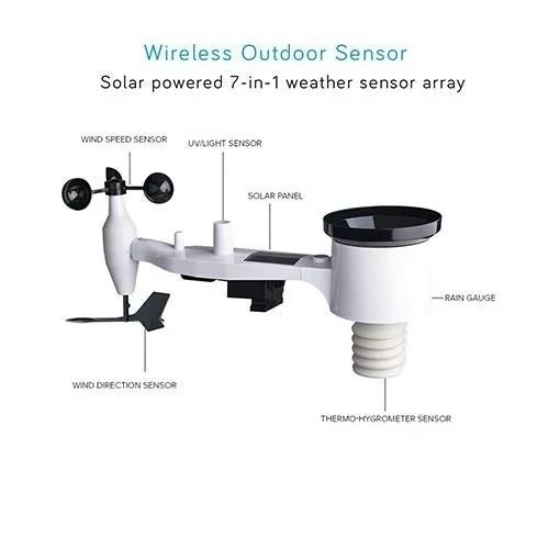 🌤 آرایهی قدرتمند ۷ در ۱ فضای باز شامل بادنما، بادسنج، سنسور UV و نور خورشید، حسگر دما و رطوبت، بارانسنج، تراز حبابی و جمعکننده خورشیدی است که دادهها را هر ۱۶ ثانیه بهروزرسانی میکند.