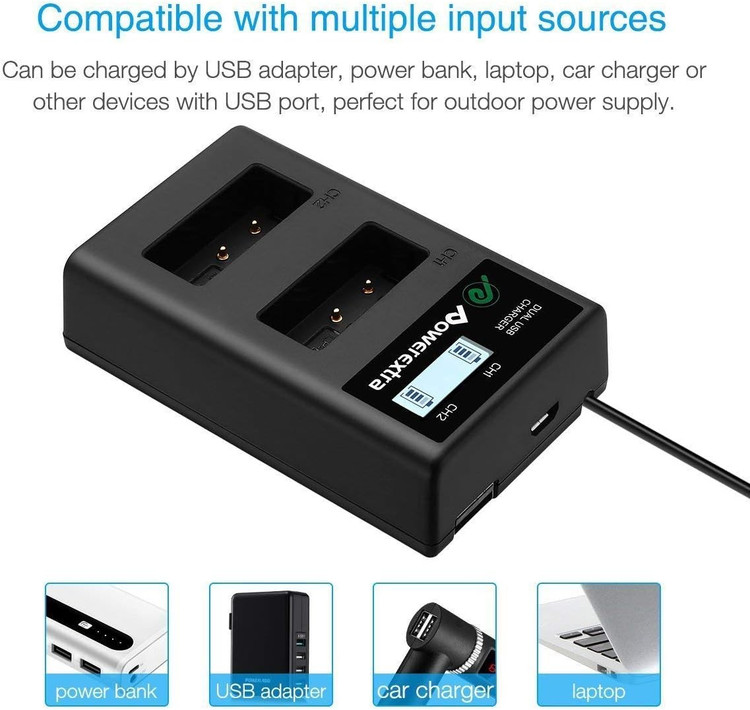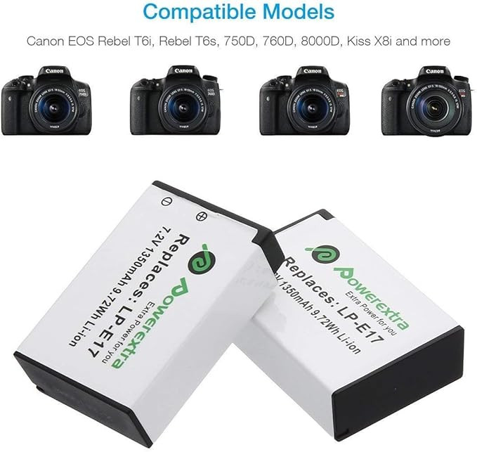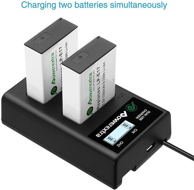 باتری جایگزین Powerextra LP-E17 با شارژر دوگانه LCD – ۲ عدد باتری ۱۳۵۰mAh برای دوربینهای کانن EOS 77D، 750D، 760D، 8000D، M3، M5، M6، Rebel T6i/T6s، Kiss X8i
