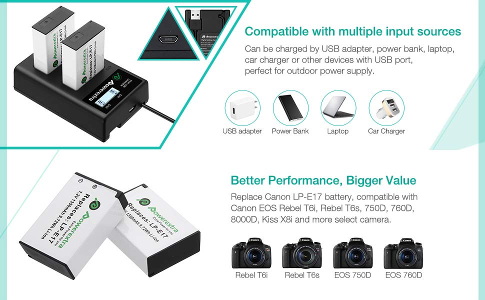 باتری جایگزین برند Powerextra LP-E17 دو عددی با شارژر دوگانه LCD | سازگار با دوربینهای کانن EOS 77D، 750D، 760D، 8000D، M3، M5، M6، Rebel T6i/T6s، Kiss X8i
