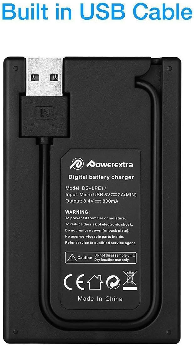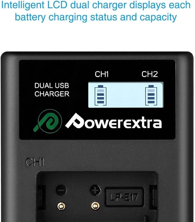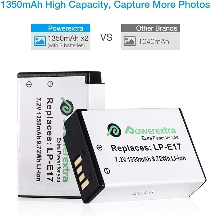 باتری جایگزین Powerextra LP-E17 با شارژر دوگانه LCD – ۲ عدد باتری ۱۳۵۰mAh برای دوربینهای کانن EOS 77D، 750D، 760D، 8000D، M3، M5، M6، Rebel T6i/T6s، Kiss X8i