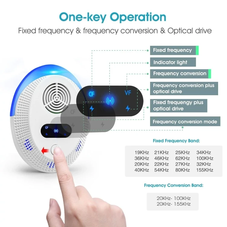 دافع اولتراسونیک حشرات، راهکاری مؤثر برای دفع سریع و مداوم انواع آفات از جمله پشه، سوسک، ساس، مورچه، کک، موش، عنکبوت و سایر جوندگان است و انتخابی ایدهآل برای استفاده در منازل و محیطهای کاری محسوب میشود.
