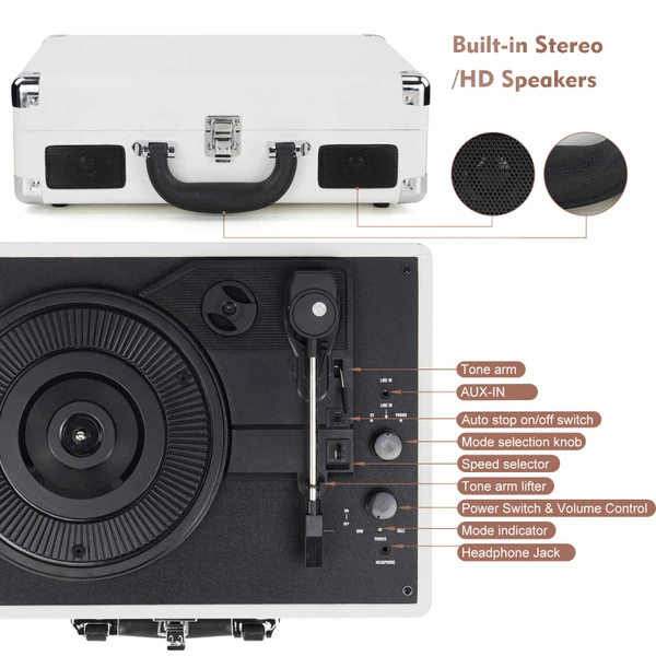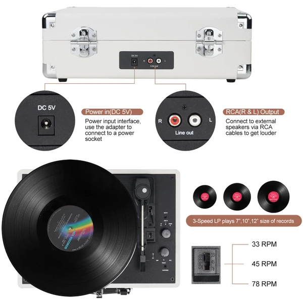 ♦【بدون نیاز به تجهیزات اضافی】 میتواند به عنوان یک پخشکننده مستقل با بلندگوهای استریو یکپارچه استفاده شود. راهاندازی آسان، کار با آن آسان. از موسیقی با کیفیت بالا در هر زمان لذت ببرید. شامل آداپتور ۴۵ دور در دقیقه، قلم، ورودی AUX، جک هدفون ۳.۵ میلیمتری.