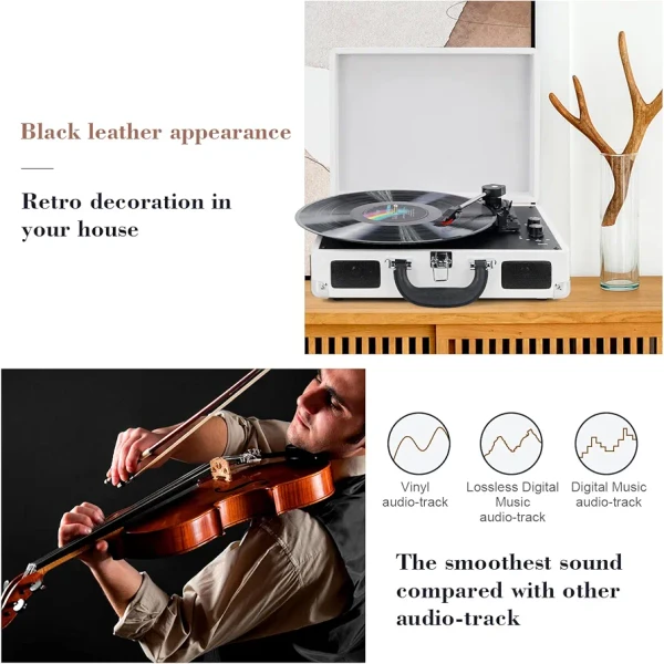 ♦【پخشکنندهی صفحهی وینیل بلوتوث】 پخش صدای MP3/گوشی هوشمند از طریق بلندگوی بلوتوث داخلی. اتصال قوی انتقال بیسیم بلوتوث، با سیگنال پایدارتر و سریعتر، به شما این امکان را میدهد که از موسیقی مورد علاقهتان آزادانهتر لذت ببرید.