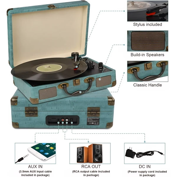 ♦【پخشکننده صفحه چمدانی قدیمی】 چمدان قدیمی با دسته حمل آسان، طراحی شیک چمدانی، میتوانید قاب را ببندید و از ورود گرد و غبار جلوگیری کنید یا فقط قفل را ببندید و مانند یک چمدان کوچک آن را بردارید و به جای دیگری ببرید. این گرامافون با بلوتوث دارای نمای بیرونی بافتدار زیبا است و برای هر محیطی مناسب است.