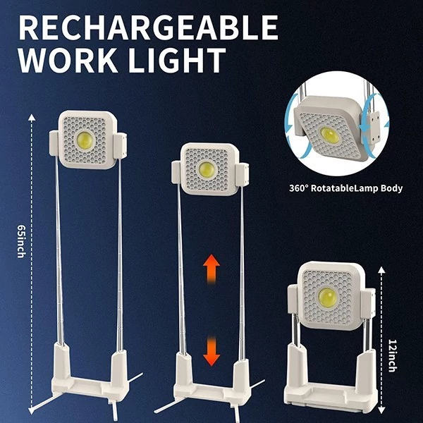 🏕 پایه قابل تنظیم و قلاب حمل: چرخش 360 درجه، قابل استفاده روی زمین، میز یا آویزان