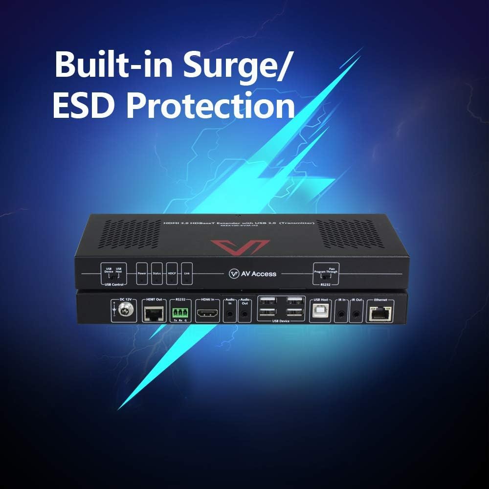 توسعهدهنده KVM 4K HDBaseT امکان کنترل کامل کامپیوتر از راه دور را تنها با یک کابل شبکه فراهم میکند. این دستگاه بهصورت همزمان دارای 1 پورت USB Host و 4 پورت USB 2.0 در هر دو بخش فرستنده و گیرنده است و به شما اجازه میدهد کیبورد، ماوس و سایر تجهیزات USB را بدون هیچ تأخیری کنترل کنید.