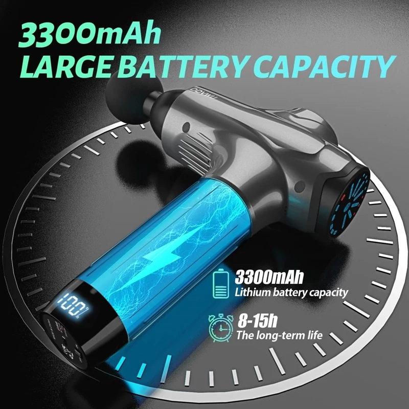 این تفنگ ماساژ به باتری لیتیومی 3300 میلیآمپری مجهز است که با یک بار شارژ، 8 تا 15 ساعت کارکرد مداوم را فراهم میکند.