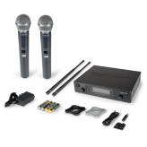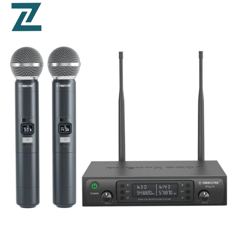 سیستم میکروفون بیسیم دوگانه UHF با امکان انتخاب فرکانس، کیفیت صوتی حرفهای و اتصال پایدار را ارائه میدهد.