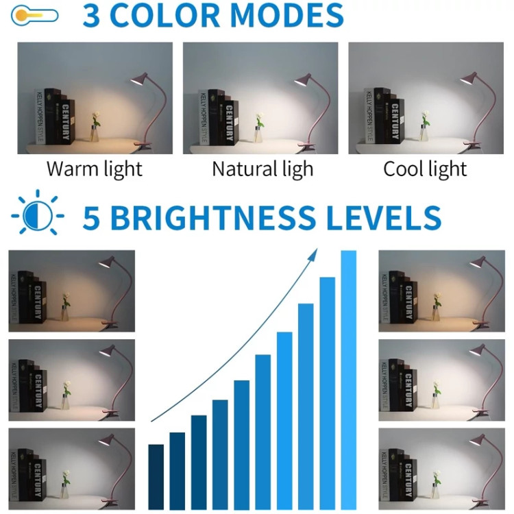 این چراغ مطالعه USB دارای ۳ دمای رنگی مختلف شامل نور گرم، نور طبیعی و نور سفید است. هر رنگ ۵ سطح روشنایی دارد و در مجموع ۱۵ حالت نوری ایجاد میکند تا در مطالعه، کار، نقاشی یا استفاده شبانه، دقیقاً نوری مطابق نیاز خود داشته باشید.