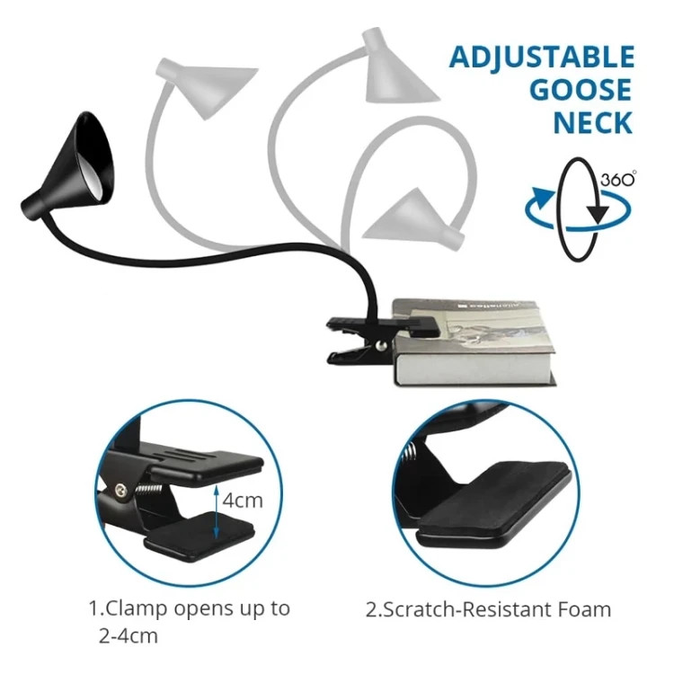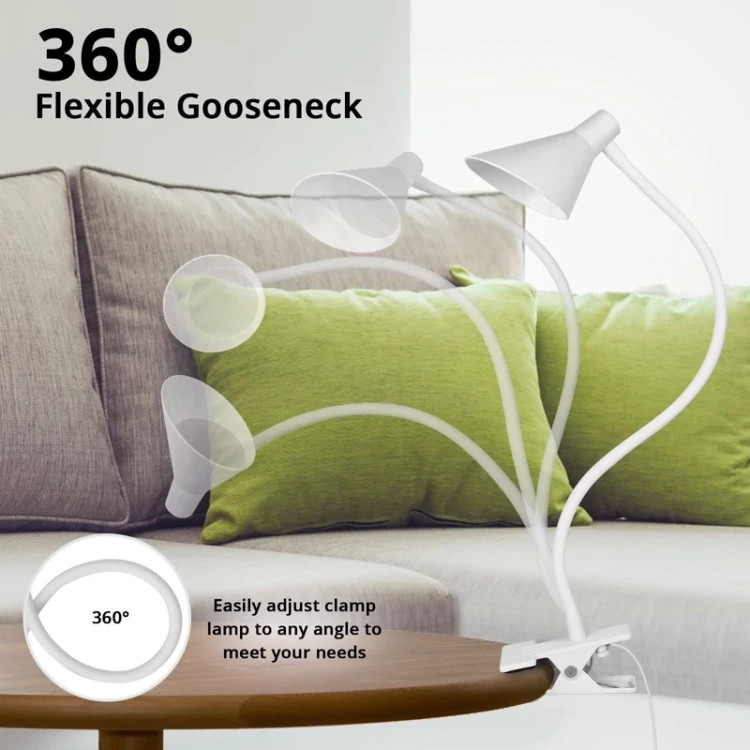 گیره مقاوم چراغ امکان نصب آن روی لبه میز، قفسه کتاب، میز کار، کنار تخت و بسیاری از سطوح دیگر را فراهم میکند، بدون اینکه آسیبی به سطح وارد کند. این کار به صرفهجویی در فضای میز کمک میکند. (توصیه نمیشود چراغ را روی سطح میز قرار دهید.)